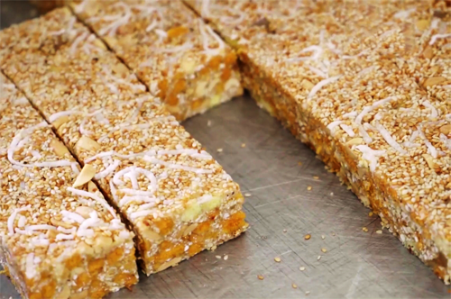 Gạo nếp dùng để làm bánh được chia làm 2 phần, một phần đồ xôi với nước quả gấc tạo nên màu hồng thắm; phần còn lại đồ xôi với nước quả dành dành tạo nên màu vàng tươi. Hai loại xôi này đều được giã bằng chày như làm bánh giầy. Sau khi giã nhuyễn đều, cán mỏng, cắt thành lát như mứt bí rồi sấy khô. Sấy xong cho vào chảo mỡ lợn đang sôi đảo đều tới khi lát bánh thơm giòn. Các nguyên liệu phụ như lạc, vừng được rang chín ròn, xát bỏ vỏ. Gạo nếp hoa vàng được rang cho nở tung, sạch trấu và dậy mùi thơm. Mỡ lợn khẩu muối đường hơn nửa tháng, đem ra thái nhỏ như hạt lựu, xào ngọt lấy độ trong, giòn. Cà rốt xào nước đường, nước gừng, vỏ quýt tươi được cũng cần được chuẩn bị một cách đầy đủ.